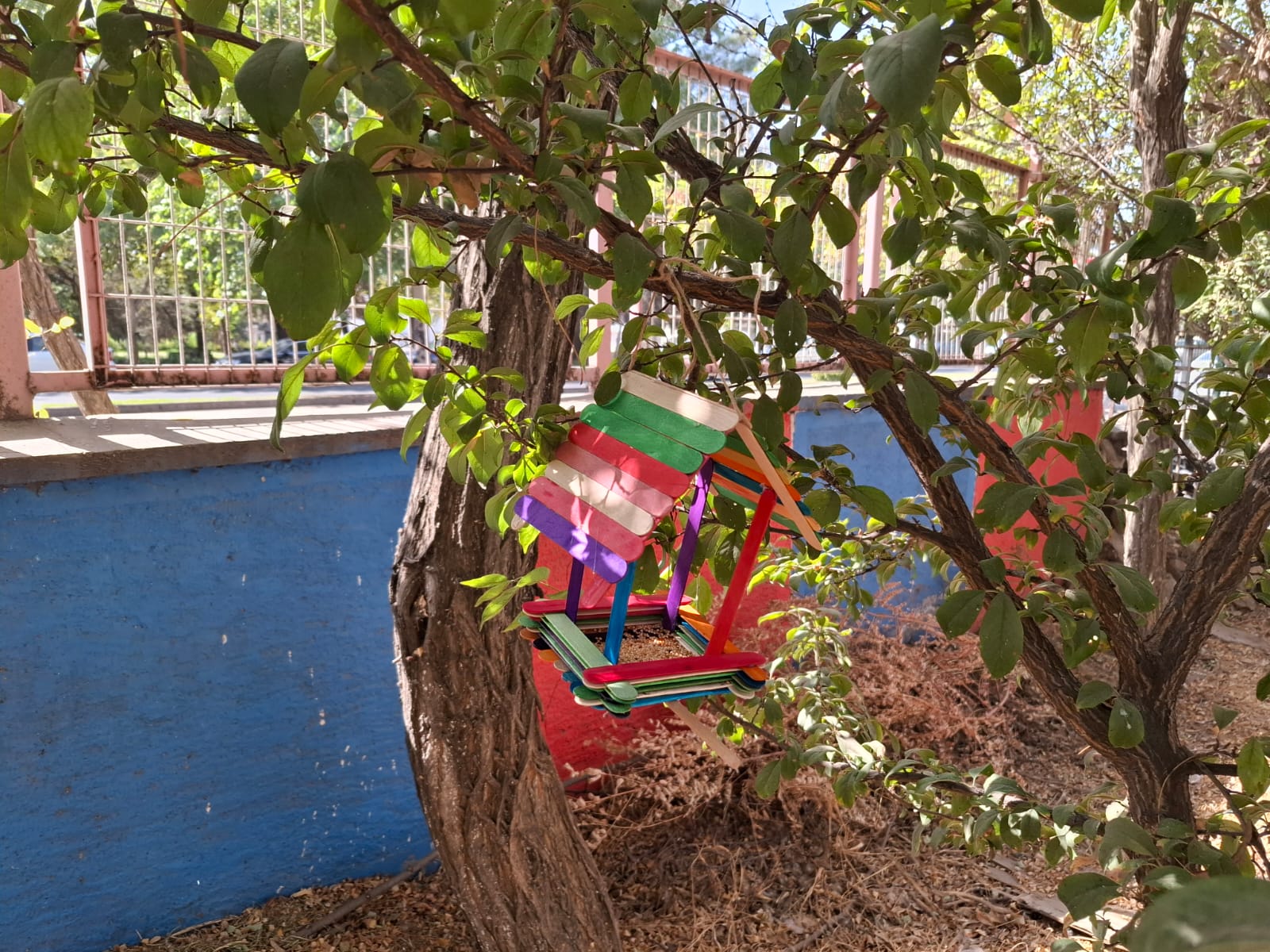 Çocuklarla birlikte renkli abeslang çubuklarından kuş yemliği hazırlanıp okul bahçesindeki ağaçlara asıldı.